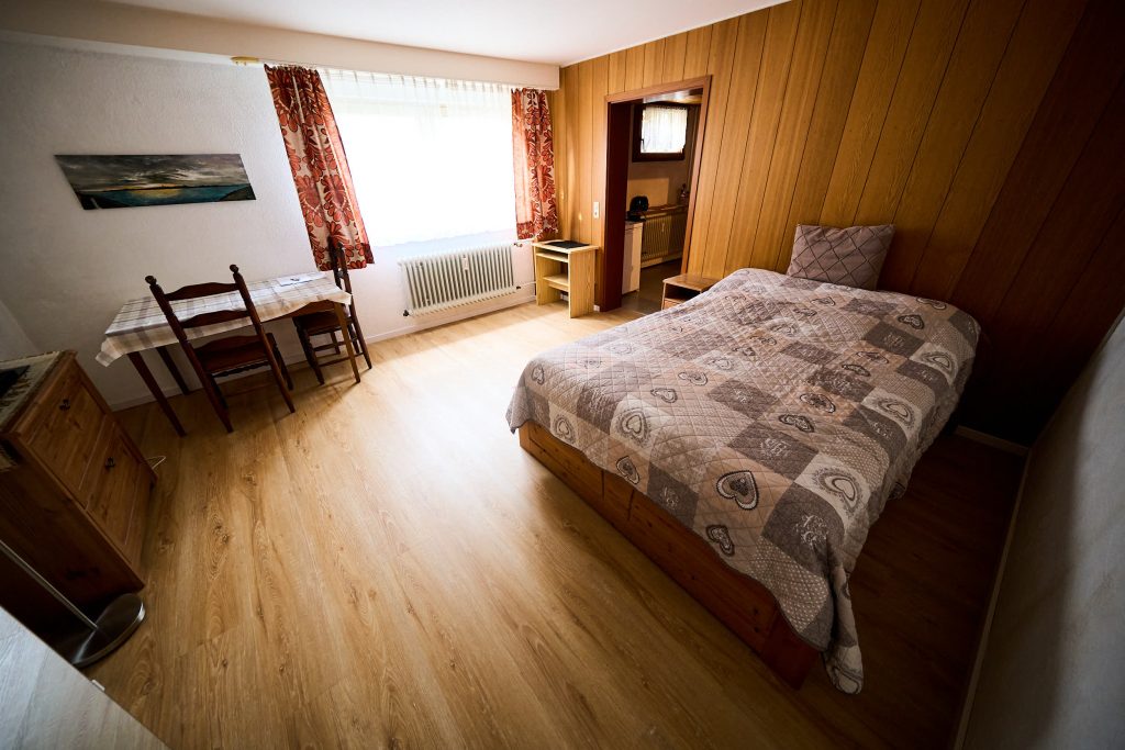 Die Wohnung selbst verfügt über ein großzügiges und hell durchleuchtetes Schlafzimmer, inklusive einem Fernseher und einem Esstisch.